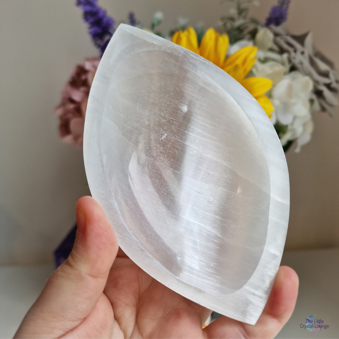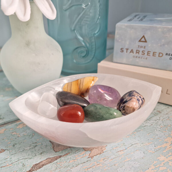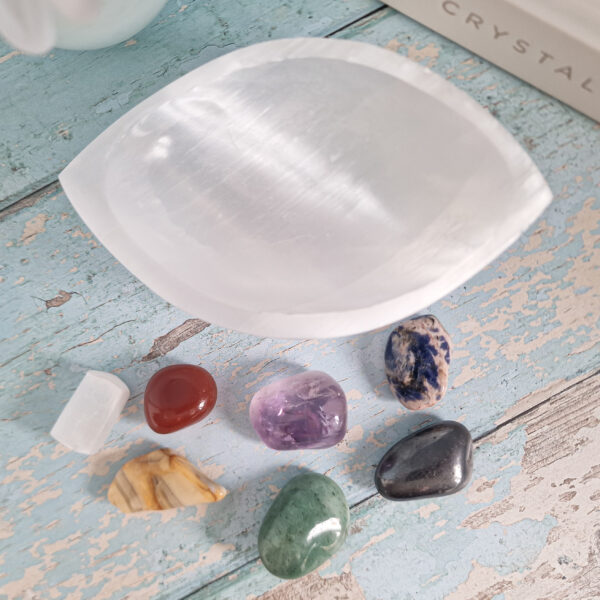 Available in 2 buying options, you can choose to order just the crystals or the crystals and an eye shaped Satin Spar Selenite bowl