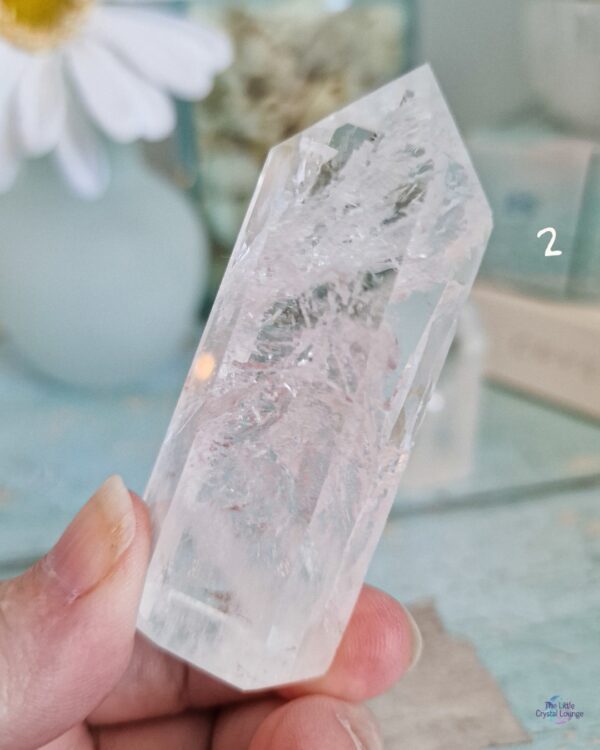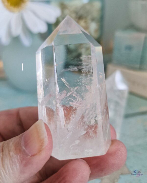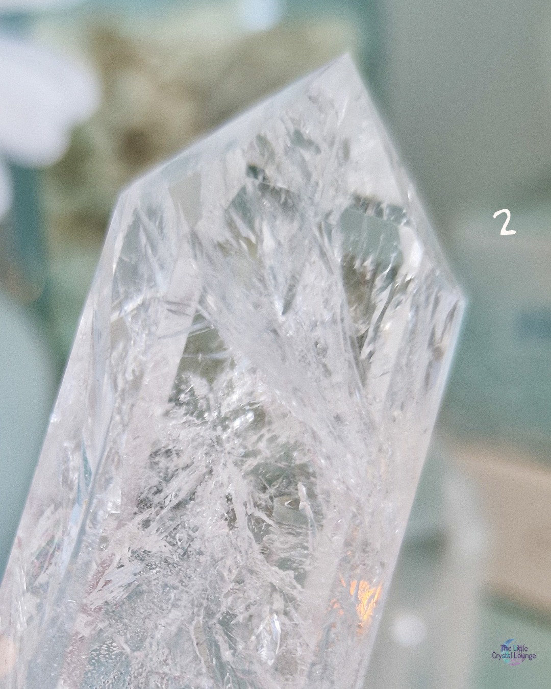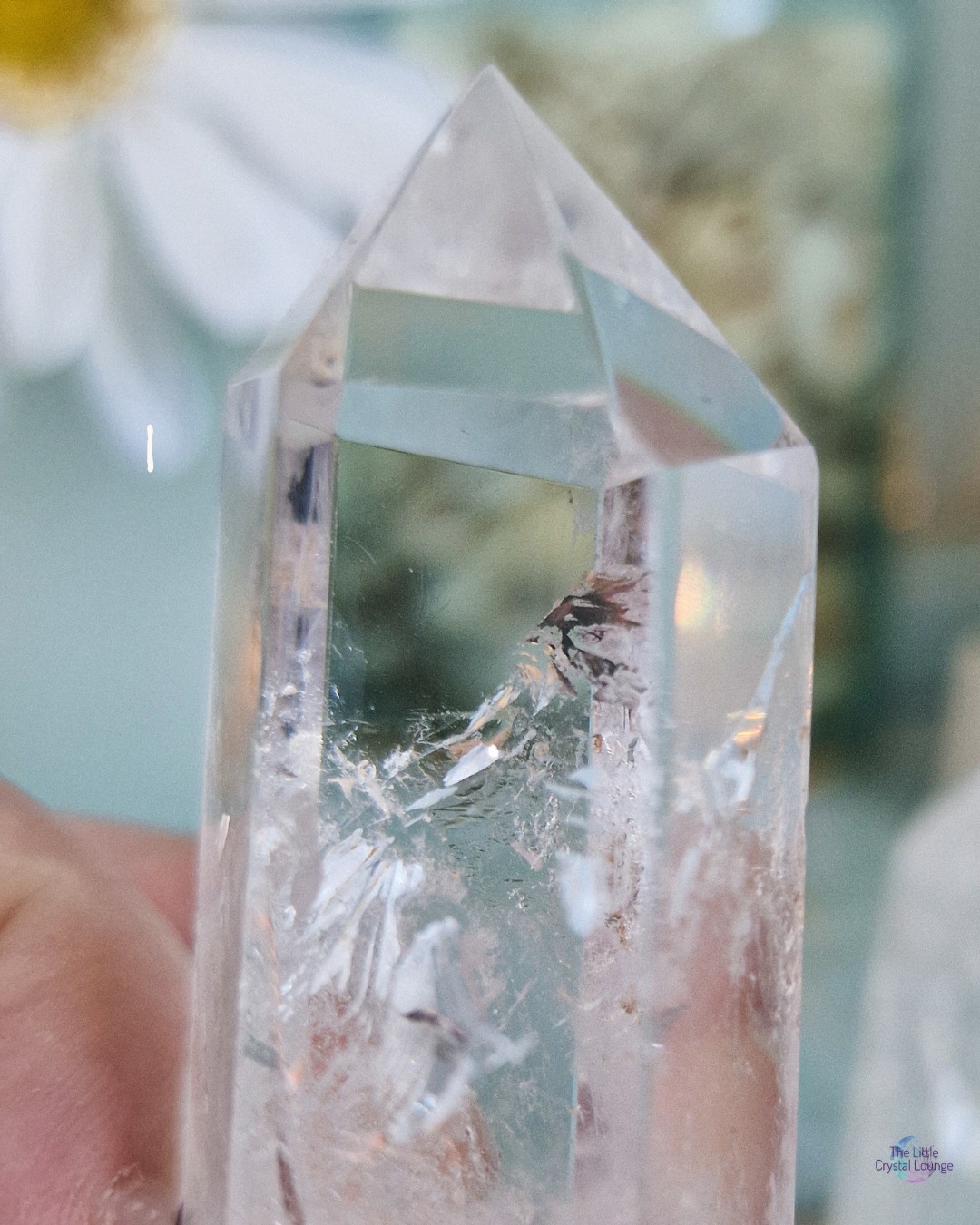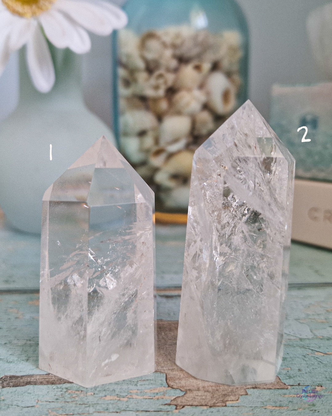 These stunning Clear Quartz points have been polished to perfection, each one completely unique. One features a soft internal crackle toward the base, while the other is filled with shimmering inclusions that create a striking “fire and ice” effect, both adding a touch of natural magic to an already powerful stone.