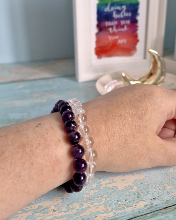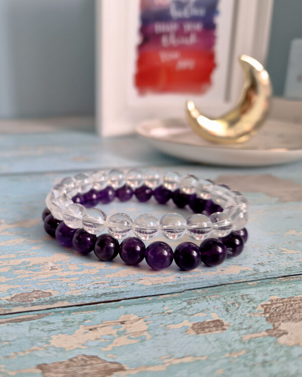 Together, these two are the perfect combo for balancing a busy mind: Amethyst soothes, Clear Quartz sharpens. Think of it as calm clarity wrapped around your wrist.
