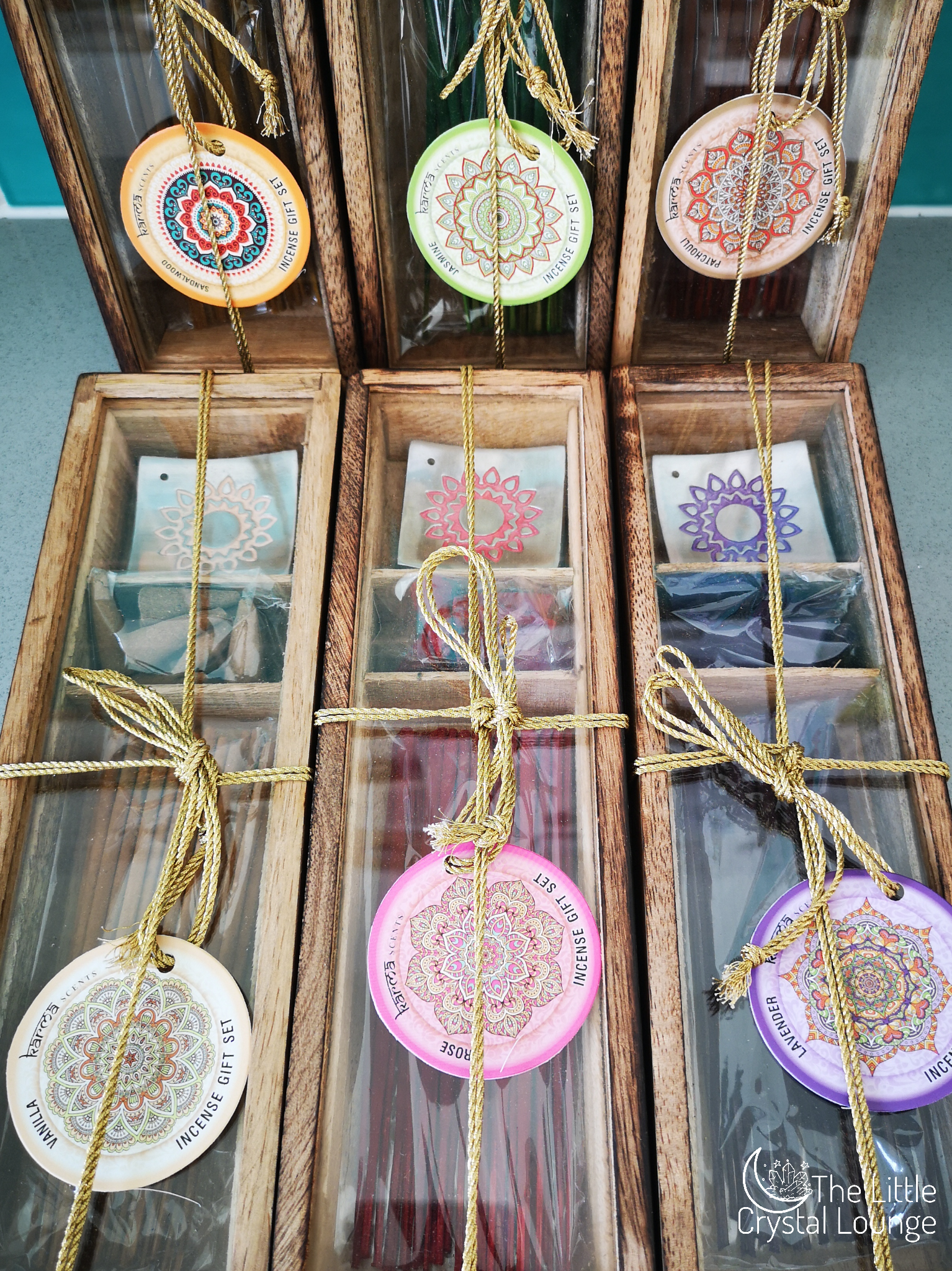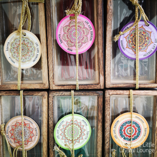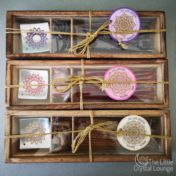 Each set includes incense sticks, incense cones and a metal holder for both.